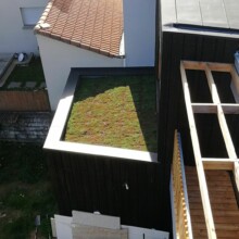 La maison est construite en ossature bois, et recherche une sobriété énergétique. Les volumes latéraux sont bardés de bois de Douglas, posé verticalement, brut de sciage avec un saturateur noir, contrastant ainsi avec la verdure environnante. Ils abritent les espaces de repos, statiques, et relient la maison avec celles de la ruelle descendante.